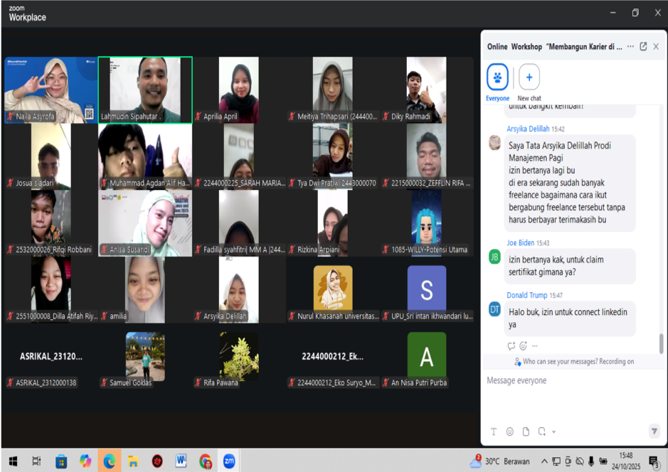 Webinar ditutup dengan sesi dokumentasi foto bersama secara virtual, mengabadikan momen berharga antara pemateri dan seluruh partisipan. Diharapkan, rangkaian insight yang diberikan dalam kegiatan ini dapat menjadi pemicu bagi peserta untuk mulai mengambil langkah konkrit dalam merancang dan mewujudkan peta karier mereka di masa depan.