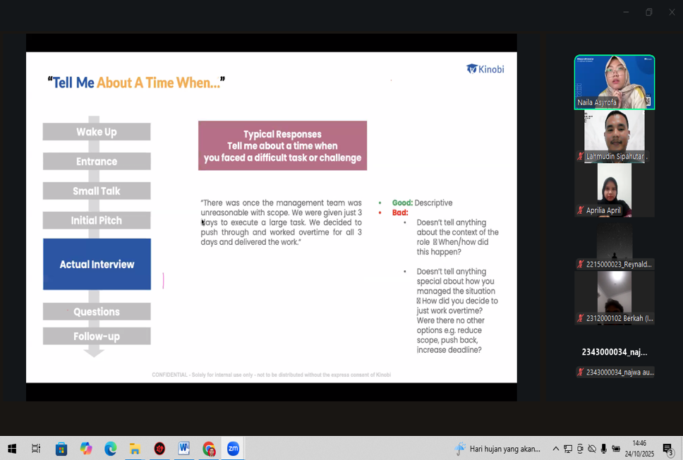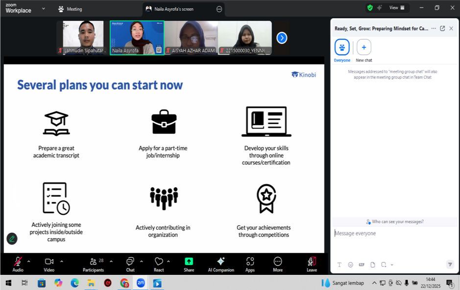 Memasuki sesi inti, webinar menghadirkan Ibu Naila Asyrofa, seorang praktisi berpengalaman yang berperan sebagai Customer Success Associate di Kinobi. Dengan pemaparan yang interaktif, Ibu Naila membagikan wawasan mendalam mengenai cara mempersiapkan pola pikir (mindset) yang adaptif, resilient, dan berorientasi pada pertumbuhan (growth mindset) untuk menghadapi dinamika dan tantangan dunia kerja.