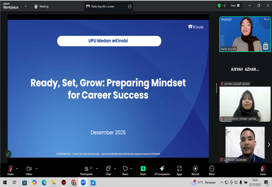 Medan, 22 Desember 2025 – Pusat Pengembangan Karir Universitas Potensi Utama menyelenggarakan webinar inspiratif bertajuk “Ready, Set, Grow: Preparing Mindset for Career Success” Kegiatan yang dilaksanakan via Zoom Meeting pukul 14.00-16.00 WIB ini merupakan upaya strategis untuk membekali para peserta, terutama mahasiswa, dengan pemahaman dan kesiapan mindset yang tepat sebelum memasuki dunia profesional.